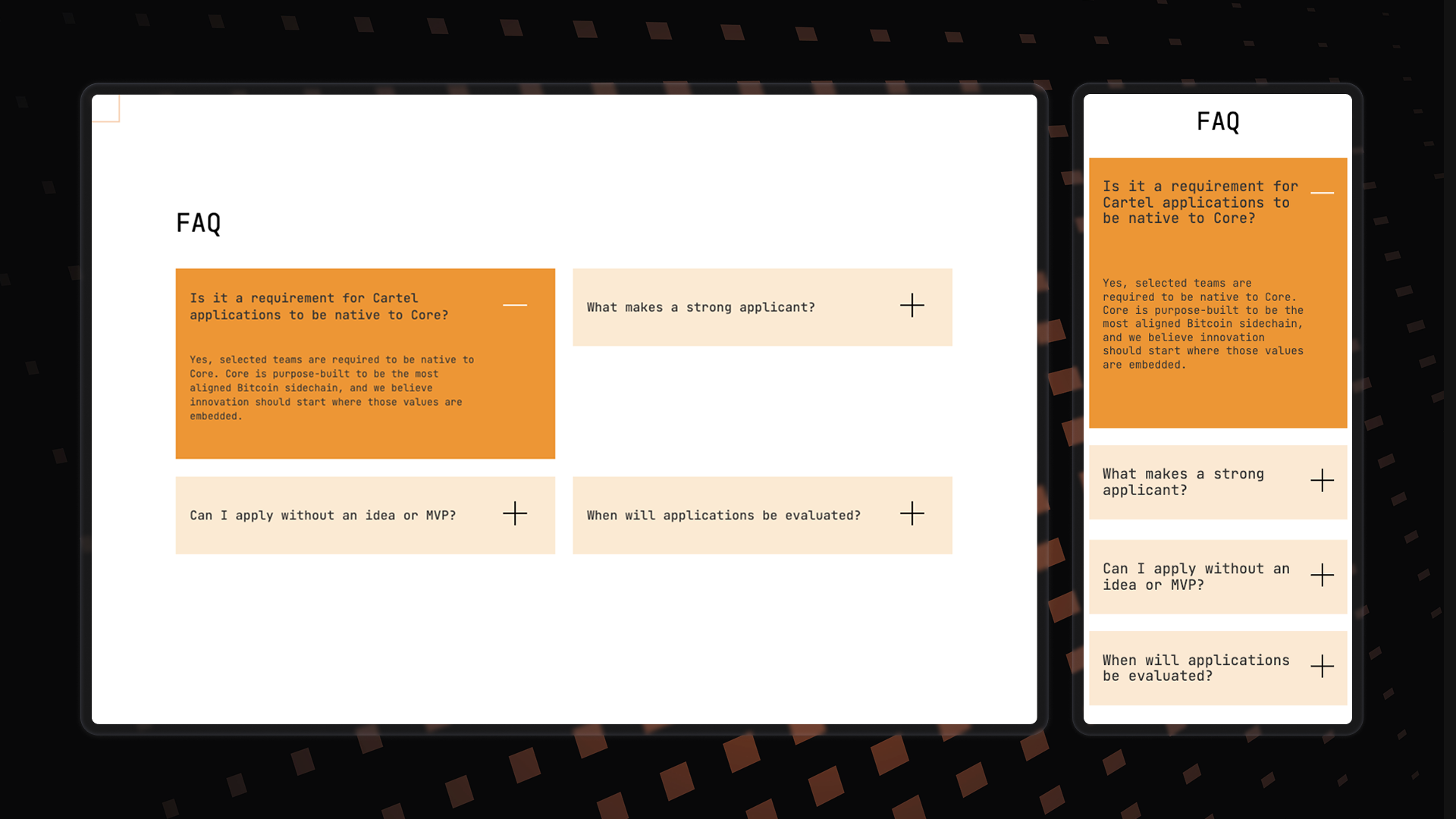 The page employs a sleek dark theme with custom-coded interactions mouse cursor proximity triggers animated orange grid boxes for a premium, responsive feel that immerses developers in the "cartel" aesthetic from the hero section onward. Scannable sections break down benefits (yield access, builder events, strategic resources) with bold typography and hover effects, funneling visitors toward membership CTAs while balancing exclusivity with accessibility for Bitcoin and DeFi developers.