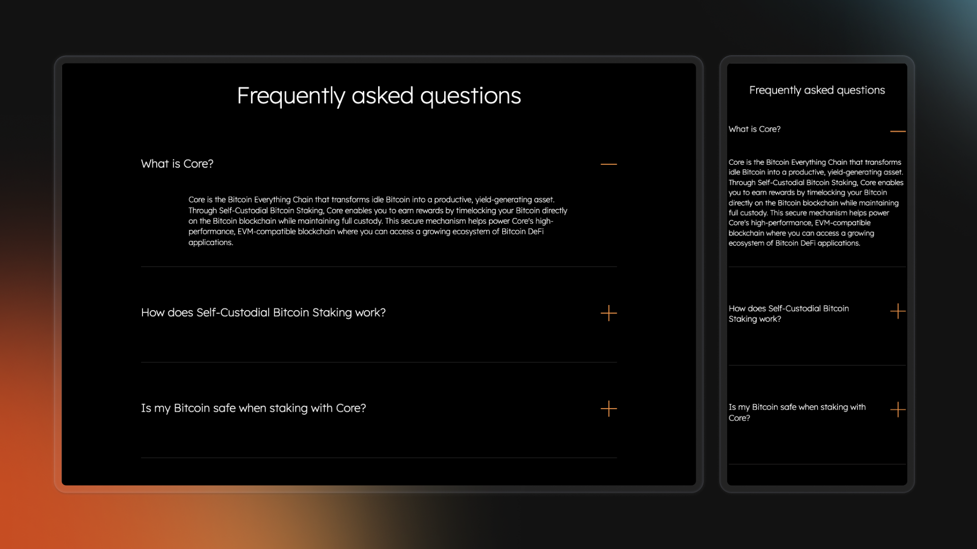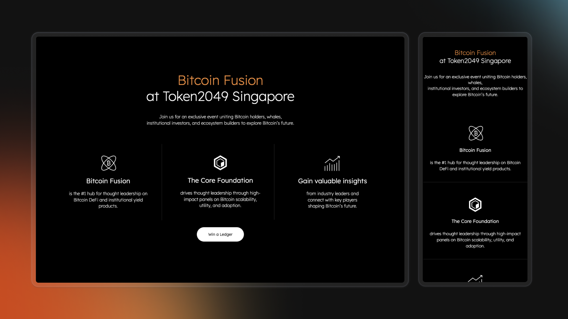 The design is structured as a tight, single‑scroll event funnel that blends marketing and education: a bold, dark hero foregrounds TOKEN2049 details and the Ledger giveaway, while subsequent sections introduce Bitcoin Fusion as a thought‑leadership hub and break down Core’s staking and yield products into digestible blocks and FAQs. Clear visual hierarchy, repeated value‑driven phrases (“unlock Bitcoin’s yield potential,” “Bitcoin Everything Chain”), and prominent CTAs create a narrative‑driven experience that helps both technical and non‑technical users understand Core’s role in Bitcoin DeFi and quickly move from interest to action.