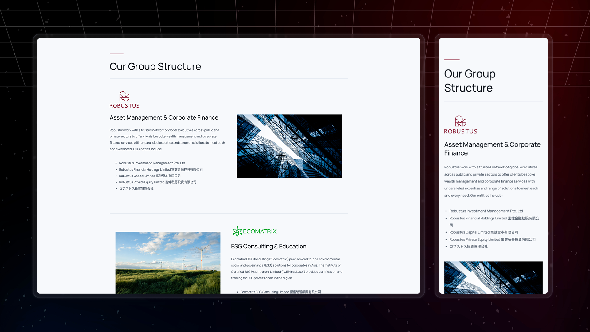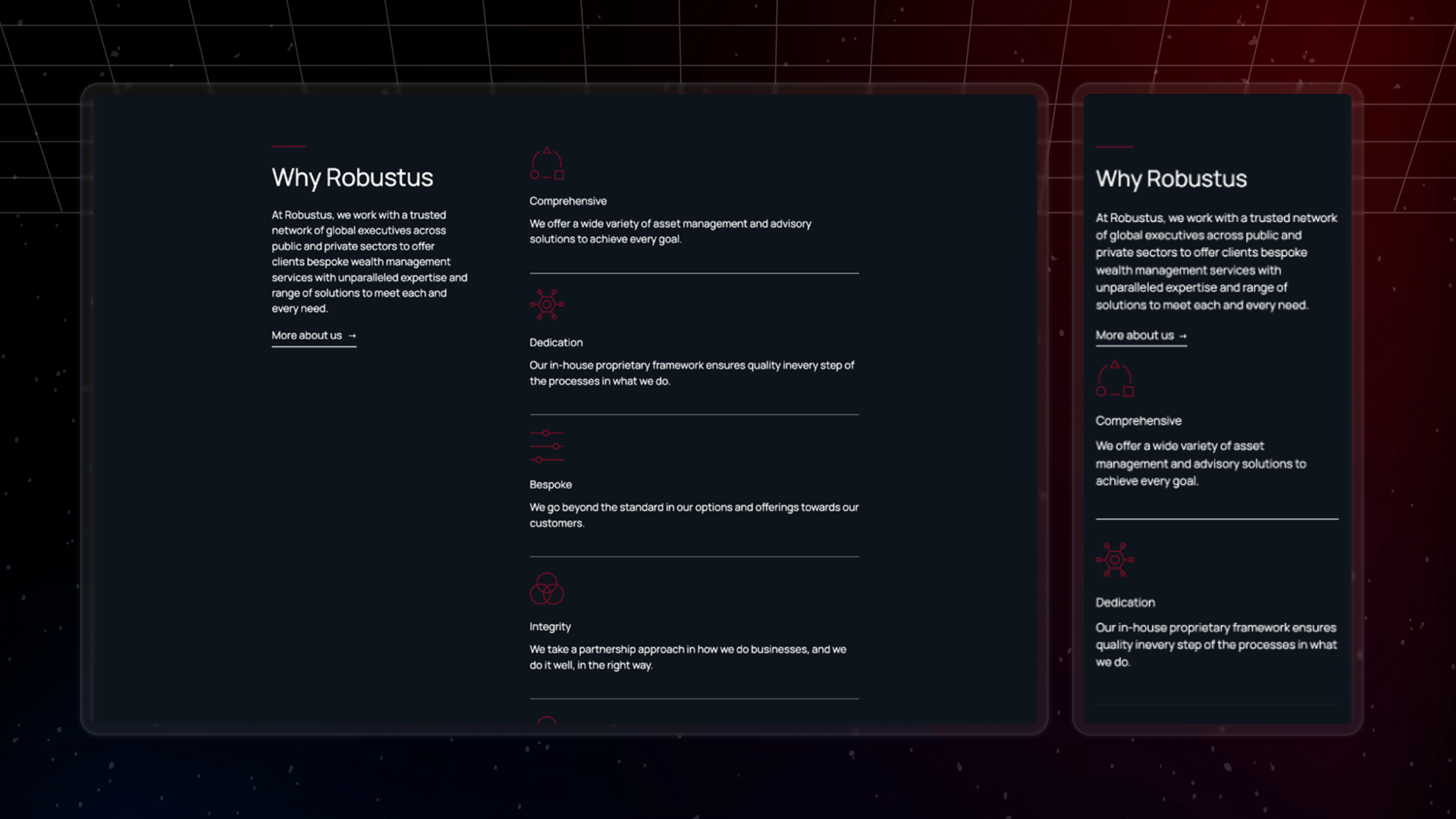 Above the fold, I custom-coded interactive backgrounds that respond to user movement, creating subtle engagement without distraction. This technical flourish gives the site a sophisticated, professional edge that aligns with Robustus's innovative brand identity.