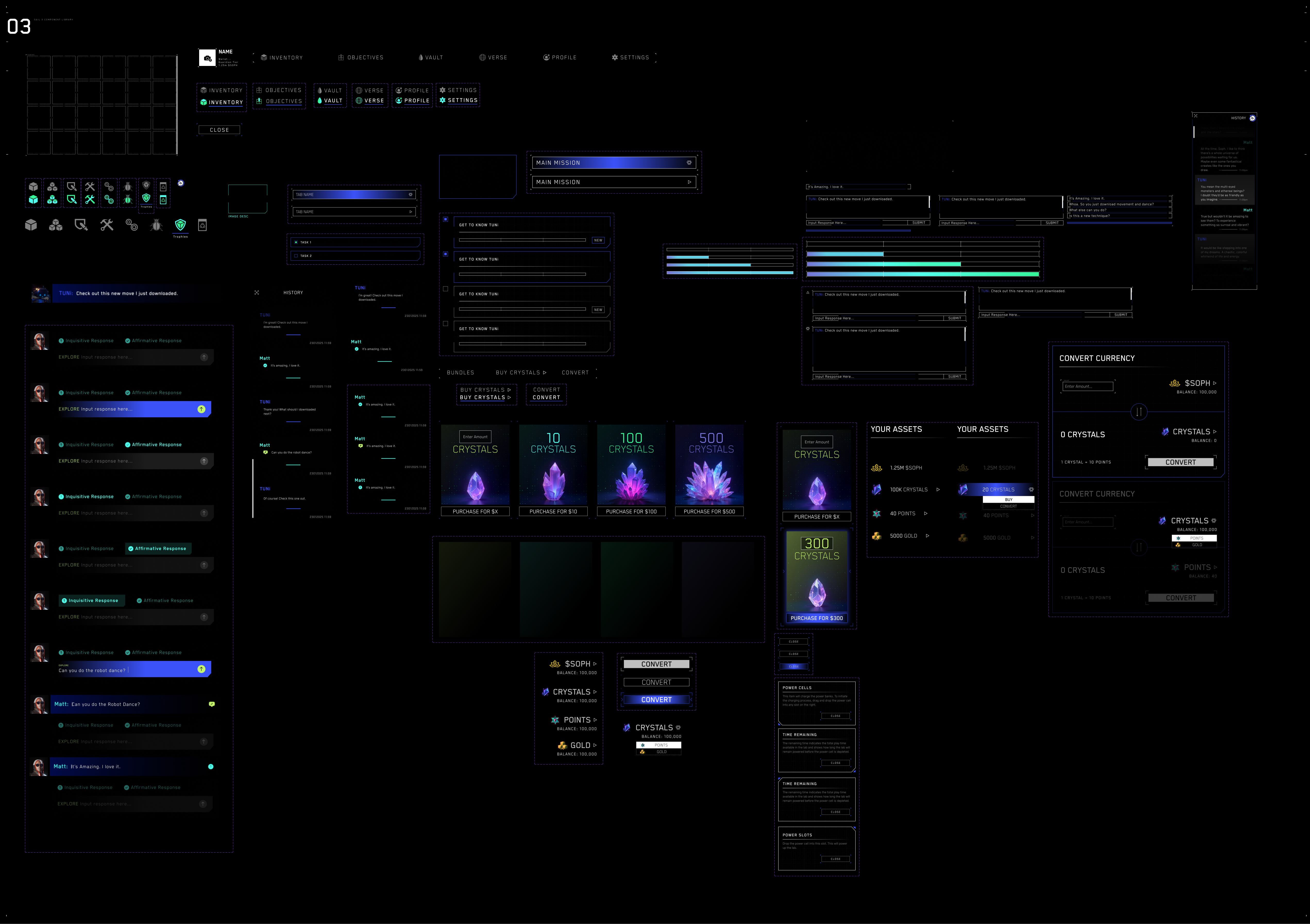 As UI design lead, my first goal was to build a unified design system that brought consistency to Sophiaverse’s futuristic identity. From button styles to navigation flows, every interaction was standardized to feel seamless whether users were gaming, chatting with AI, or exploring Web3 features. I built the entire system in Figma with reusable components and dynamic variants, enabling effortless collaboration and pixel‑perfect consistency across the platform.