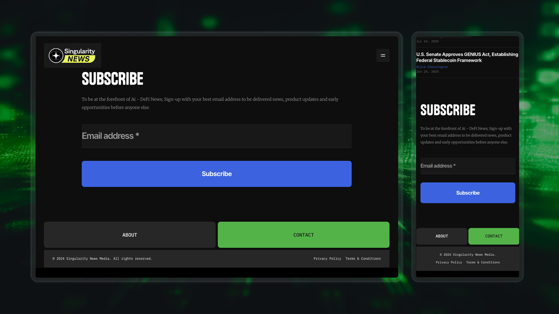The client needed a visual identity and web experience that could capture the tone of technological advancement without overwhelming readers with visual noise. The challenge was to balance sophistication with energy: to present complex tech narratives in a way that felt sleek, credible, and forward‑thinking. The design also needed to distinguish Singularity News as a standalone brand, while retaining subtle continuity with The Capital Trends ecosystem.
